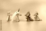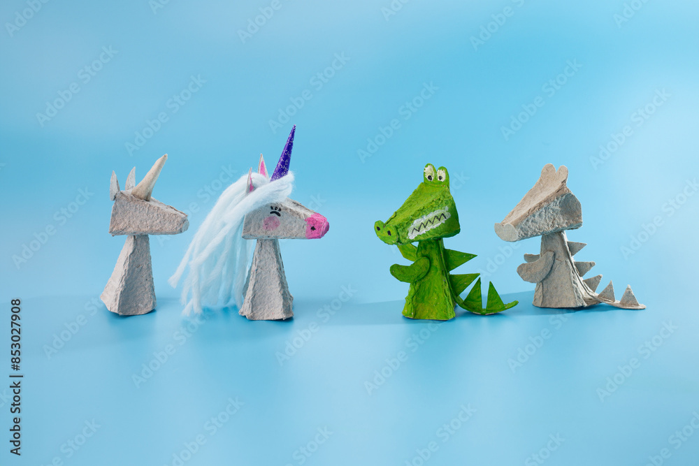 Recycled material concept: crafted toy animals including unicorn, alligator, miniature figurine. DIY finger toys in a fairy tale setting, creative character designs and sustainable crafting practices