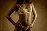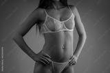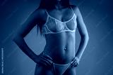 Muscular sexy fitness woman in white transparent lingerie on purple background, neon light