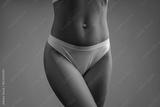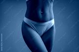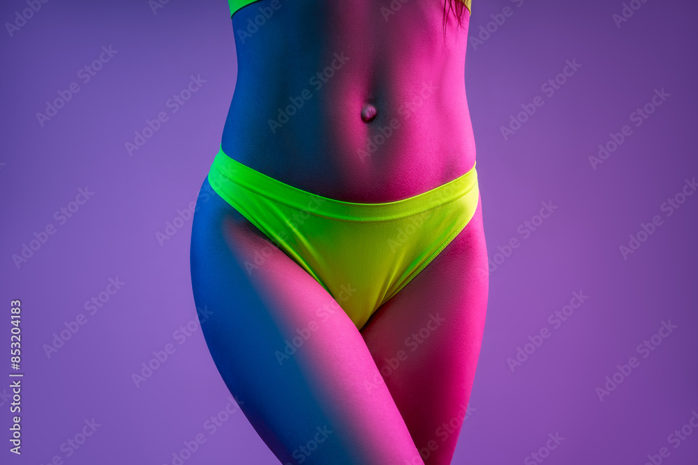 Muscular sexy fitness woman in green panties on purple background, neon light