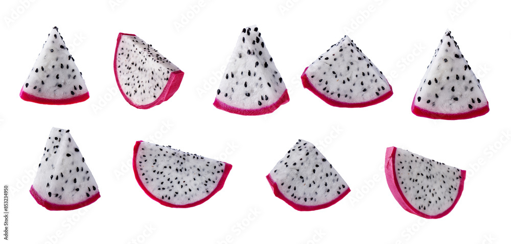 A set of dragon fruit slices isolated on transparent background. Pitaya fruit pieces for design.