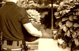Man Carrying Potted Plant in a Garden
