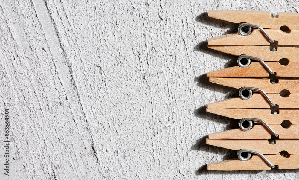 Wooden clothespins in a row on textured gray background. Creative minimalistic design, flat layout, copy space.