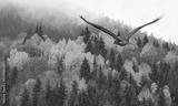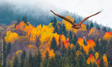 Aerial view of green trees in a forest of old spruce, fir and pine trees in wilderness with red tailed hawk