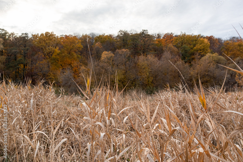 Golden autumn dry grass reeds thicket with forest in background