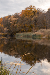 Golden trees and reeds reflecting in the calm waters of the Siverskyi Donets River