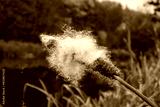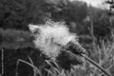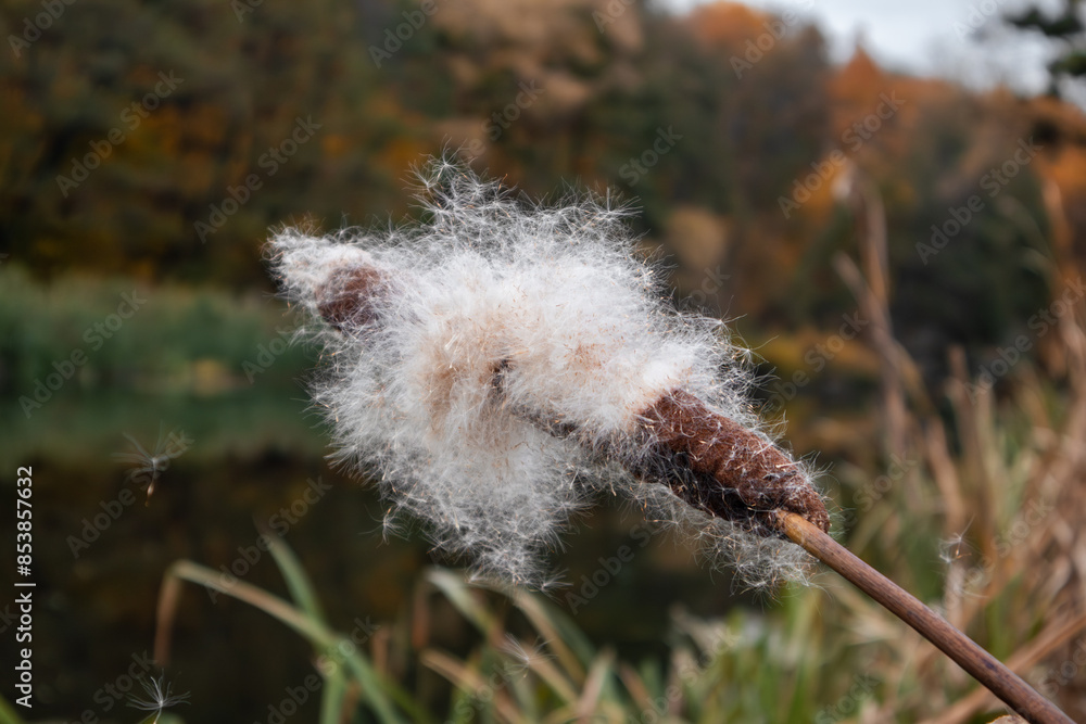 Autumnal close-up of reeds and cattail fluff by the riverside, perfect for botanical themes