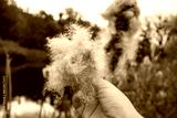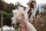 Hand holding autumnal reeds cattail fluff by riverside, adding personal touch to scenery