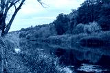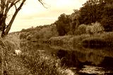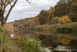Autumn on Siverskyi Donets River in Ukraine with colorful trees and grey cloudy sky