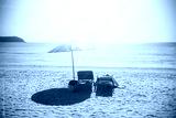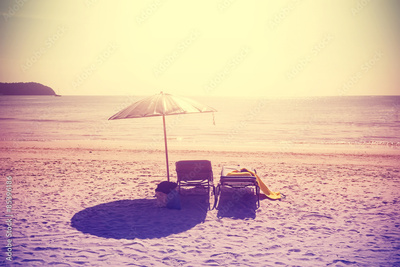 Vintage instagram stylized beach chairs and umbrella at sunset.