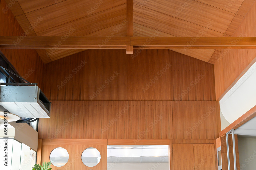 Close-up view of a modern HVAC duct system installed against a wooden vaulted ceiling with exposed beams.