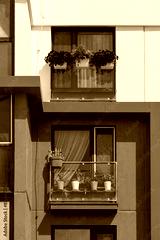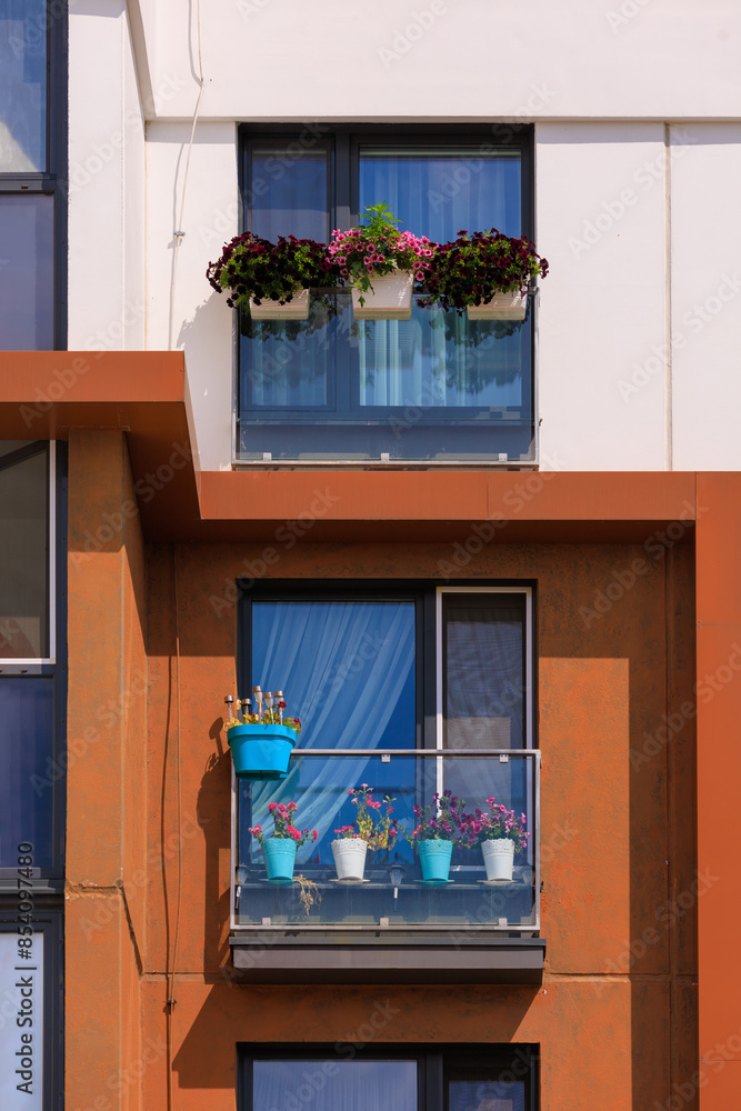 Elements of architectural decorations of buildings, modern windows, walls and balconies.