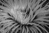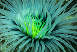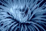 Close-up macro view of beautiful and clear and yellow Sea Anemone, actiniaria, with long tentacles on coral reef