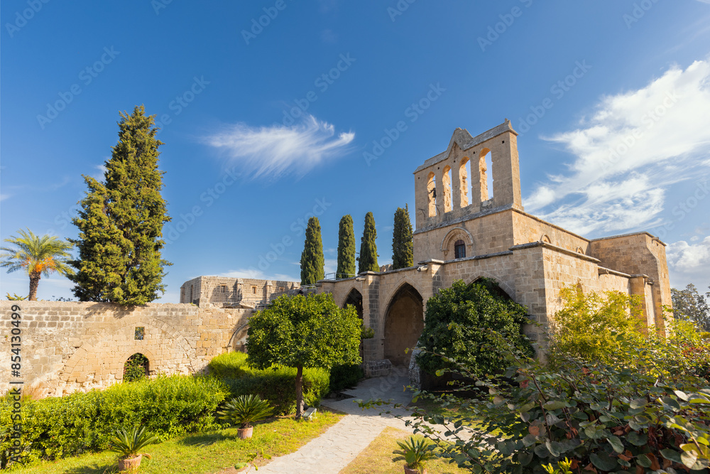 Wide angle photo of historical Bellapais Abbey in Northern Cyprus in a sunny day.