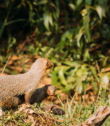 Goa, India. Three Indian Grey Mongoose Sitting On Stump In Sunny Day