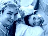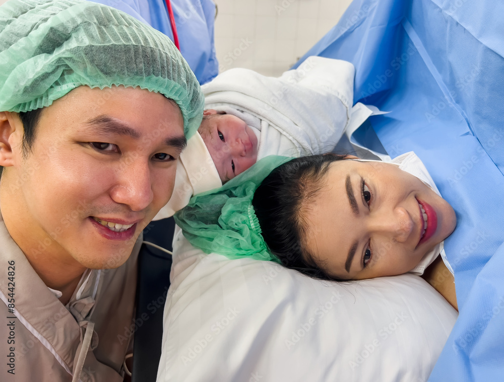 first sight of father and mother with newborn baby after the Cesarean section in operation room. happy family concept