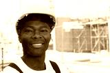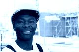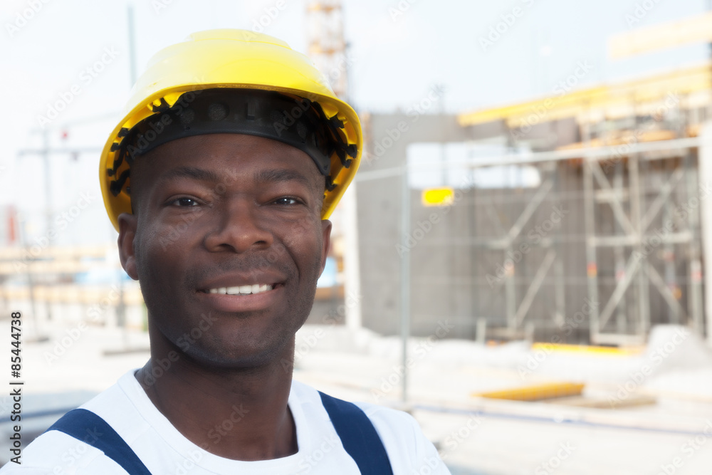 Lachender afrikanischer Bauarbeiter auf der Baustelle
