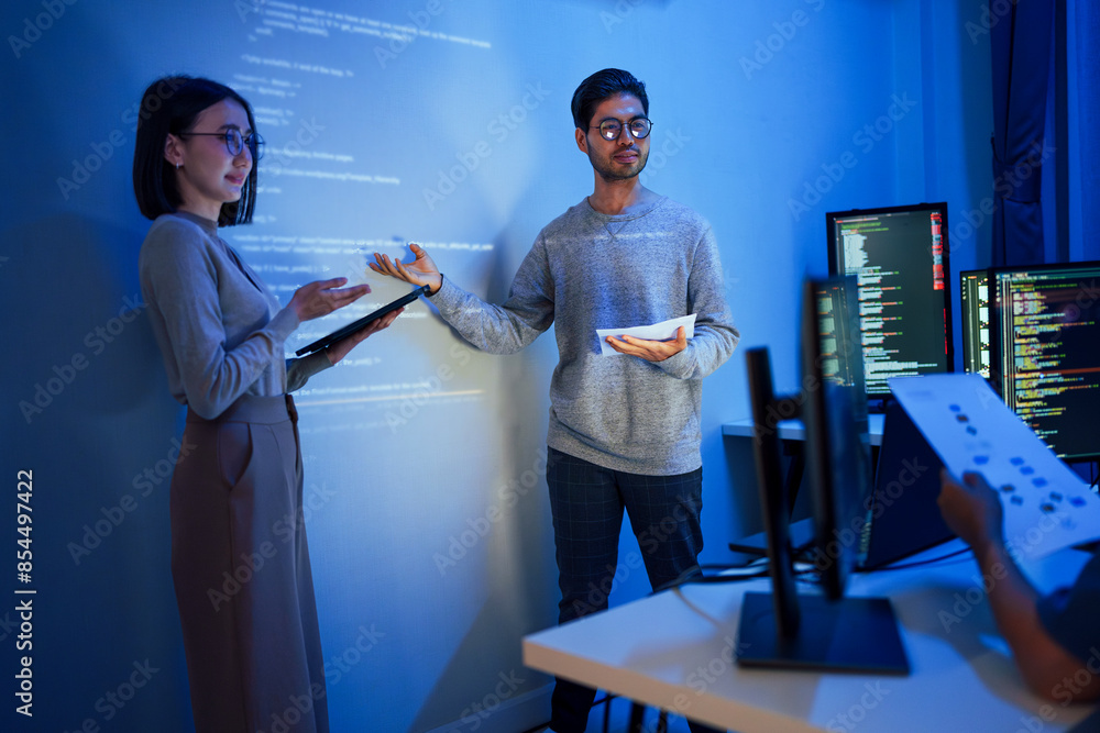 asian developer leads present code review session, pointing at code projected on the wall with colleagues teamwork and knowledge sharing in software development.