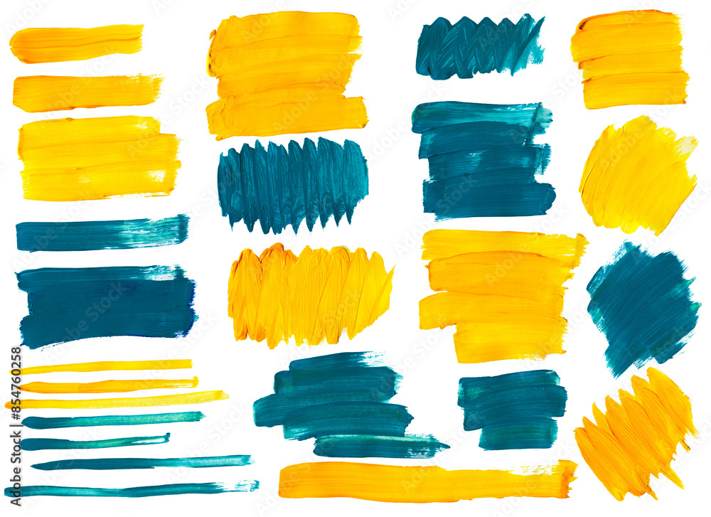 collection Oil art brush painted textured stripes isolated white background, Set palette watercolor blue yellow strokes