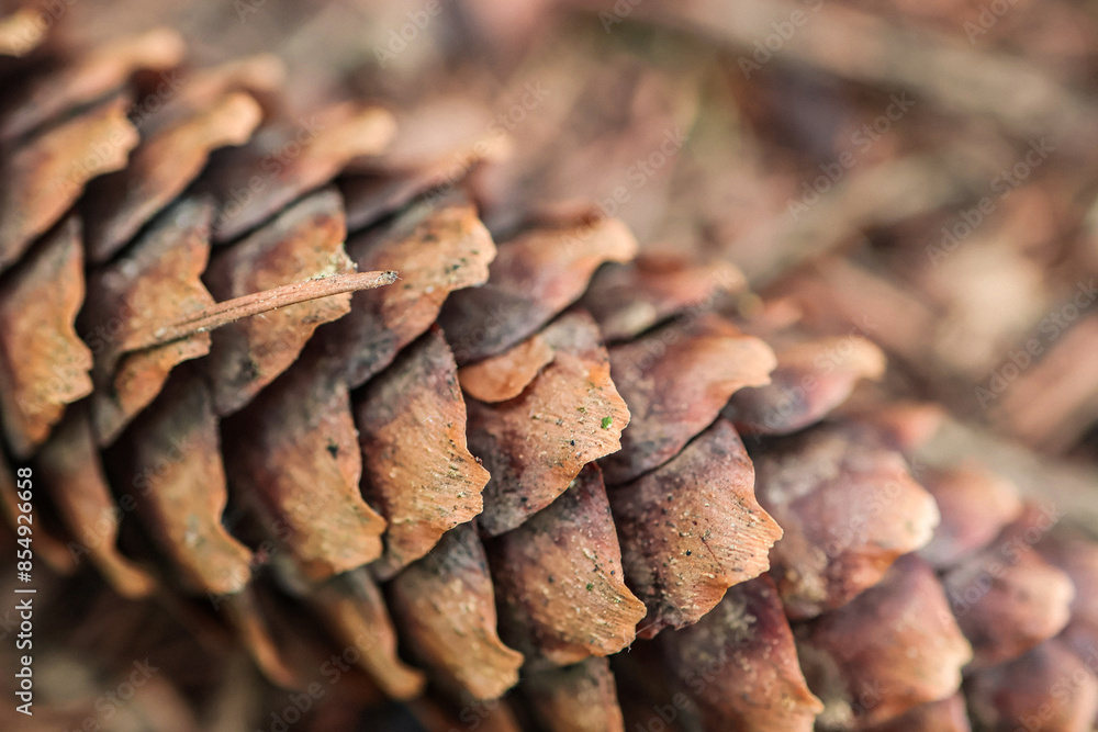 Cones in a pine forest close-up. Close-up of a cone. Scales of a cone.