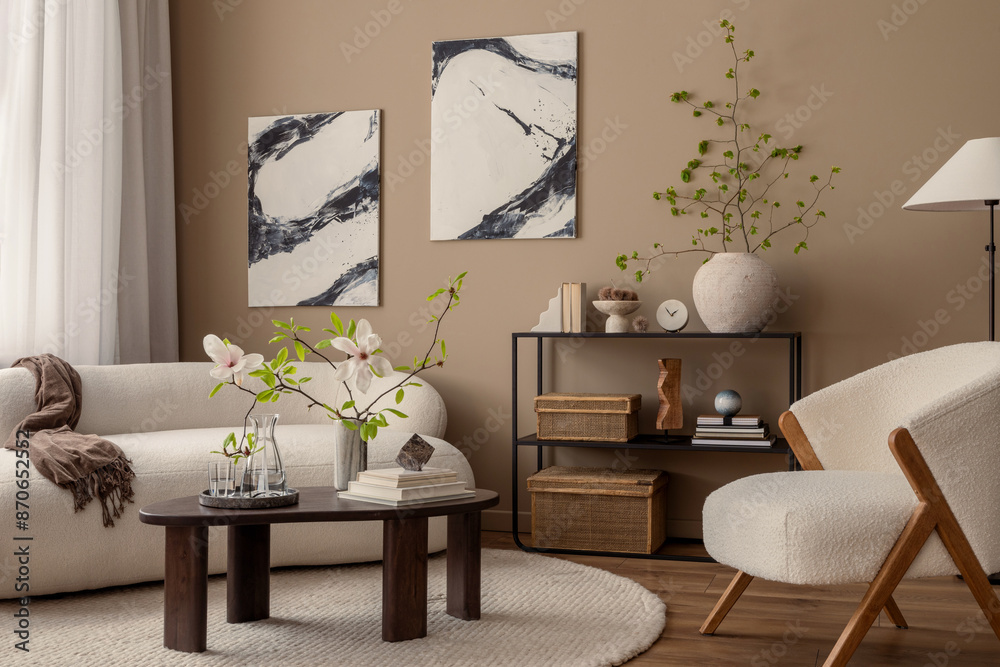 Modern and colorful interior of living room with design boucle sofa, mock up poster, shelf, plants, decorations and personal stuff. Home decor..