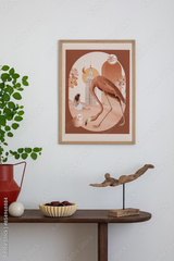 Stylish and minimalist composition on wooden design commode with mock up poster frame, flowers in vase, decorations and personal accessories. Template.