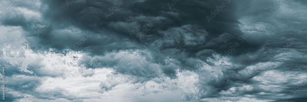 Stormy Sky Before Rain Thunderstorm. Storm Cloudy Sky Background. Panorama, Panoramic View.