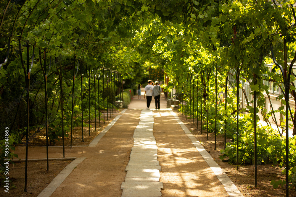 A long straight road in a grove of grapes goes off into the distance. A tunnel of grapevines in sunny summer day. People in botanical garden A garden