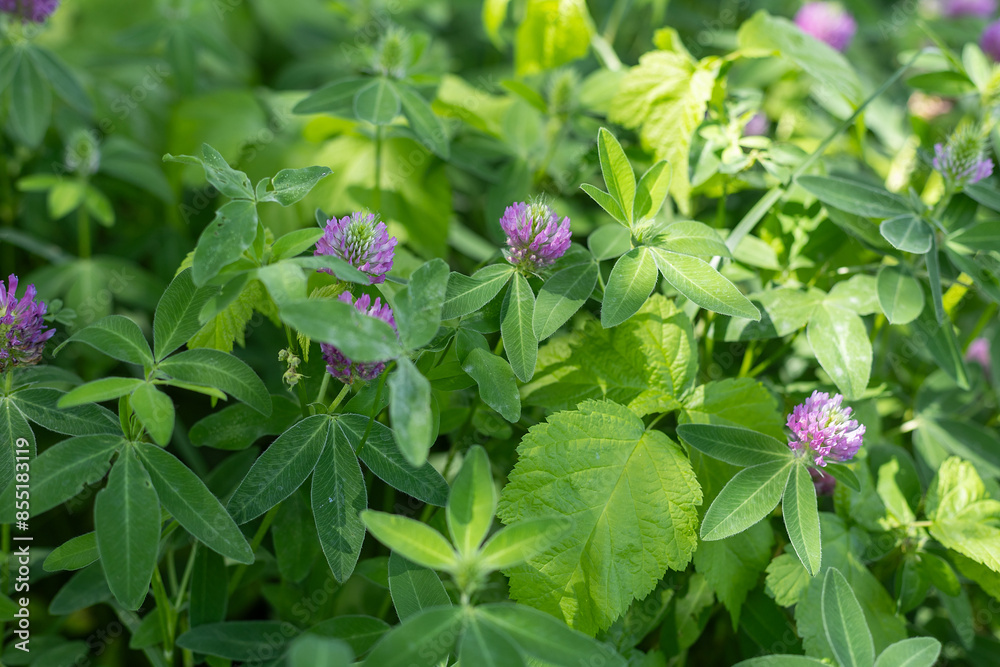 Macro photo nature field blooming clover flower. Background texture green clover with pink flowers. An image of a field of flowering clover