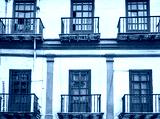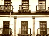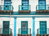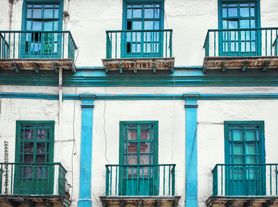 Street view of an old colonial building facade, architecture background, Cuenca, Ecuador.