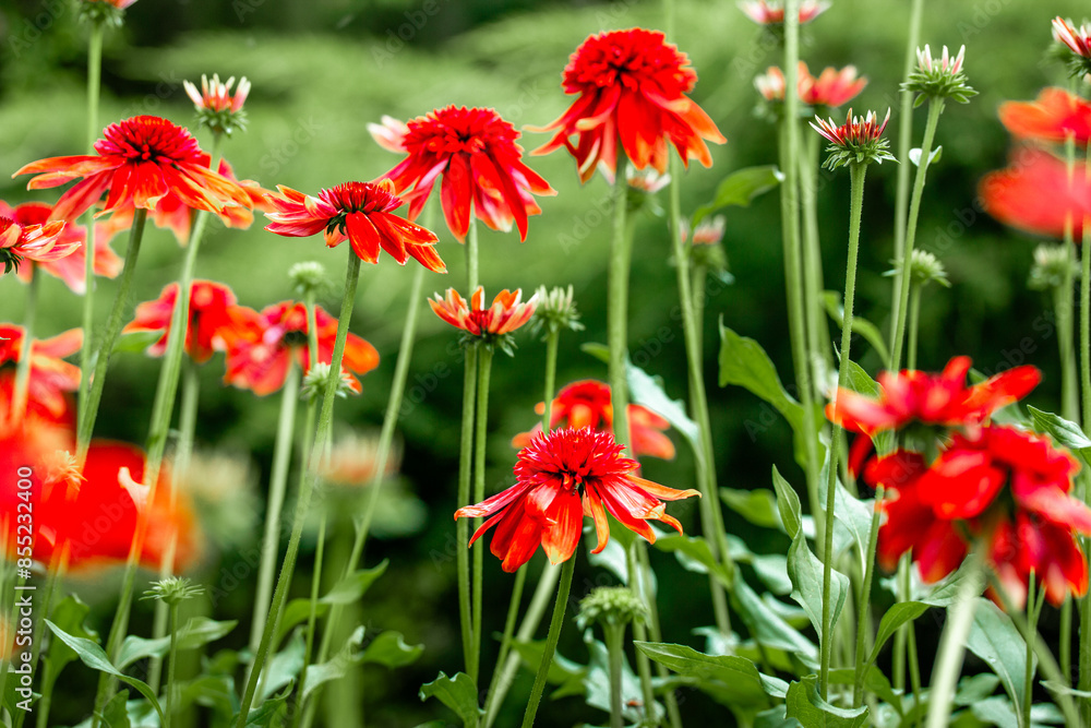 Echinacea purpurea Eccentric red bright flower buds among green leaves on natural background. Blossoming flowers in summer formal garden Medical plant