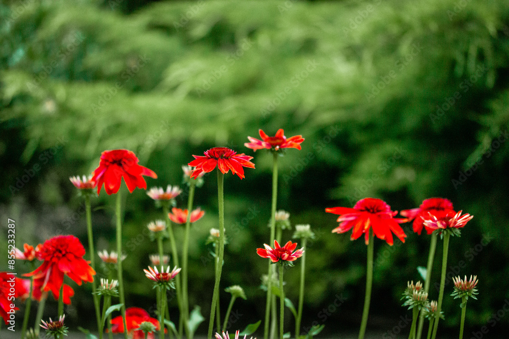 Echinacea purpurea Eccentric red bright flower buds among green leaves on natural background. Blossoming flowers in summer formal garden Medical plant