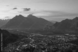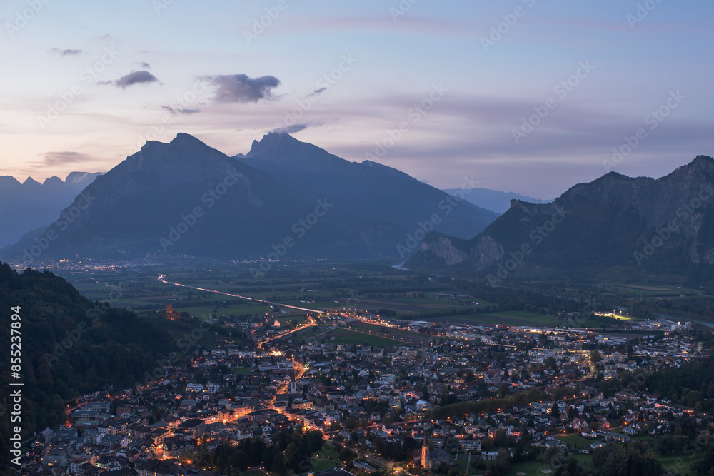 Panorama of the city of Bad Ragaz against the background of the Swiss Alps at sunset. Bad Ragaz Switzerland. Aerial view. Top view