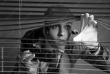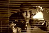 Male spy with binoculars looking through blinds on brown background, closeup