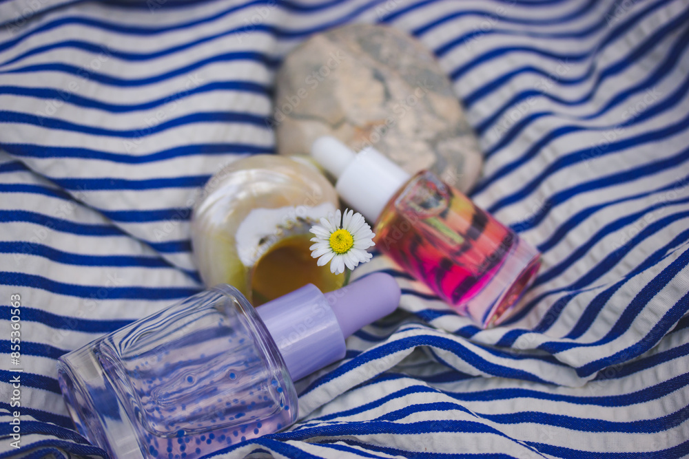 Glass cosmetic bottles with serum. Summer cosmetics for relaxation outdoors. SPF protection product on a striped cloth. Essential oils. Summer nature.