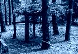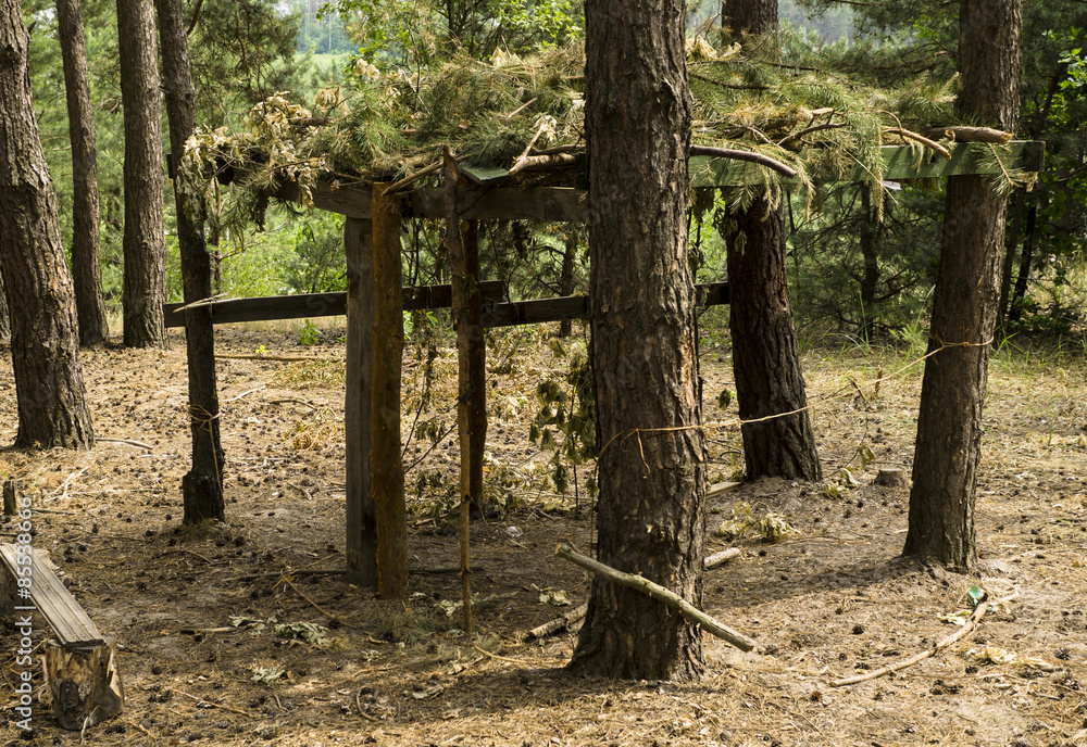 Wooden arbor with camouflage in the pine forest