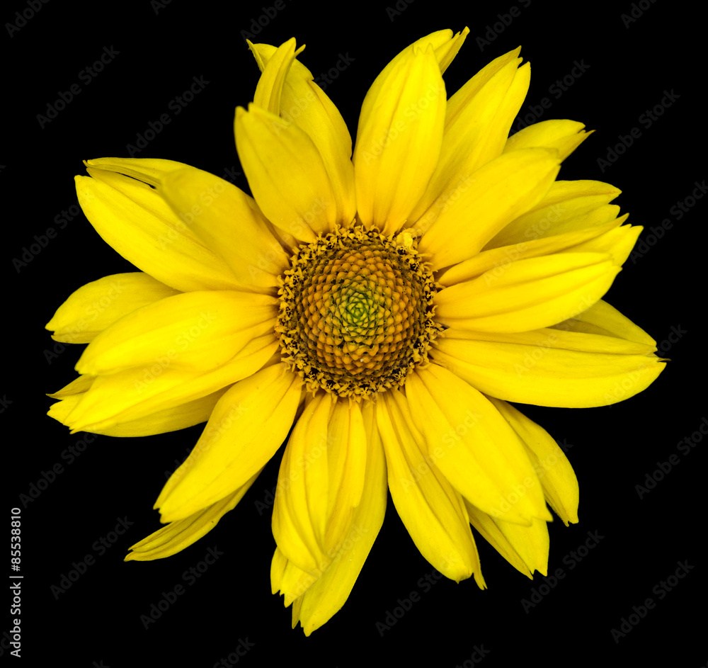 Yellow flower of a decorative sunflower Helinthus isolated on black