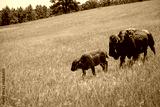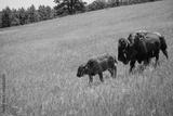 Cinnamon, Baby Bison and Mother walking down the hill in Custer State Park Wildlife Loopp Road, Black Hills Country, South Dakota, USA