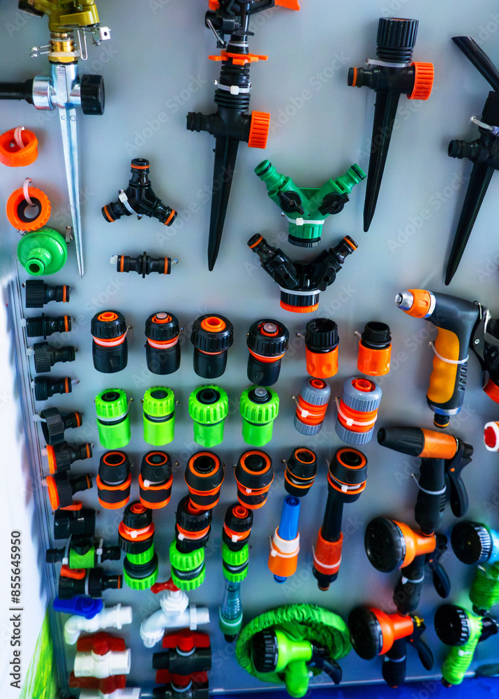 Plastic parts for garden irrigation. Connections for hoses, watering nozzles, fittings for plastic pipes.
