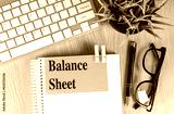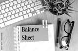 BALANCE SHEET text pink sticky on notebook with keyboard, pen and glasses