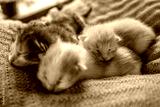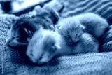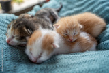 A bunch of newborn multi-colored blind cute kittens sleeping on a blanket