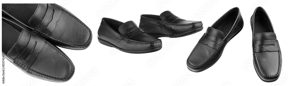 Set men's pair of black moccasins on isolated white background close-up