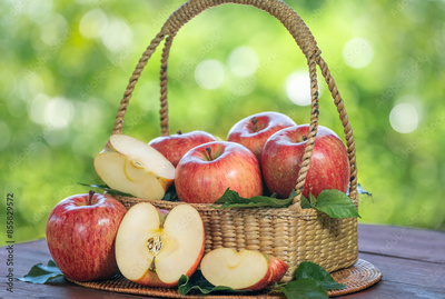Pink Fuji Apple on blurred greenery background, Fresh Pink Japanese Apple in Bamboo basket on wooden table in garden.