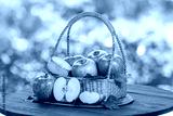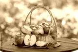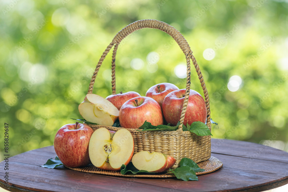 Pink Fuji Apple on blurred greenery background, Fresh Pink Japanese Apple in Bamboo basket on wooden table in garden.