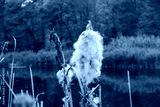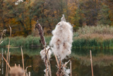 Autumn reeds cattail fluff cotton on woody riverside with reflections on water surface