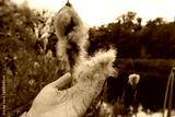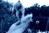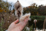 Autumnal scene with a hand holding reeds cattail fluff by the river, perfect for nature lovers