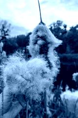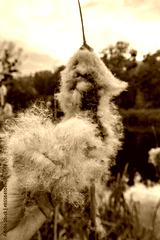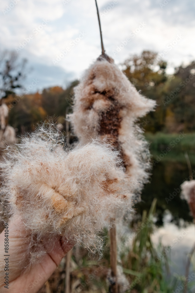 Hand holding autumnal reeds and cattail fluff by the tranquil riverside, capturing nature botany