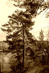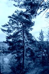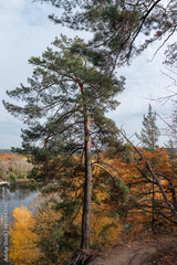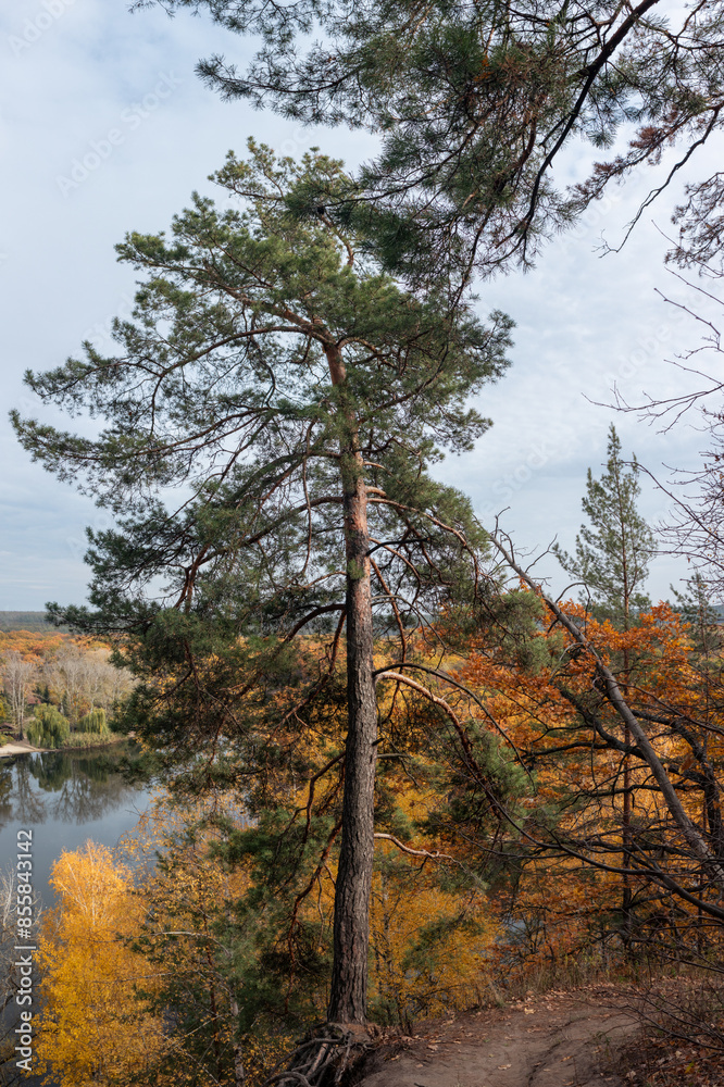 Green Pine Tree on Autumnal Riverside Hill with Vibrant Forest Colors and Dramatic Grey Sky