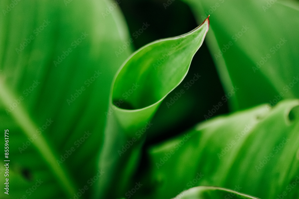 Green fresh tropical leaves background. Tropical garden nature. Plants soft details, pattern, texture. Rainforest, garden, woods, forest plants grow.