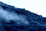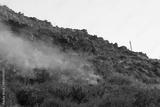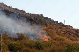 Red raging flame of fire burn in grass fields, forests and black and white smoke to sky. Big wildfire close-up. pollution in air concept.