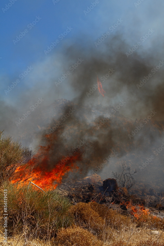 Red raging flame of fire burn in grass fields, forests and black and white smoke to sky. Big wildfire close-up. pollution in air concept.